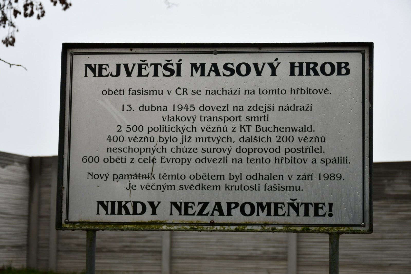 Nachází se na místě hromadného hrobu obětí pochodu smrti - transportu vězňů z koncentračního tábora Buchenwald do vyhlazovacího tábora Flossenbürg. Vlak vyrazil 8. dubna 1945 a s živými i zemřelými zastavil 13. dubna 1945 v Tachově, odkud vězni museli jít do cílové stanice pěšky. Ve vlaku bylo na místě 400 mrtvých, dalších 200 vězňů neschopných pochodu doprovod postřílel nebo pobil. Na místě zůstalo 600 mrtvých těl, které byly odvezeny na nový židovský hřbitov, naházeny do vykopané jámy v prostoru hřbitova, polity dehtem a tři dny páleny.