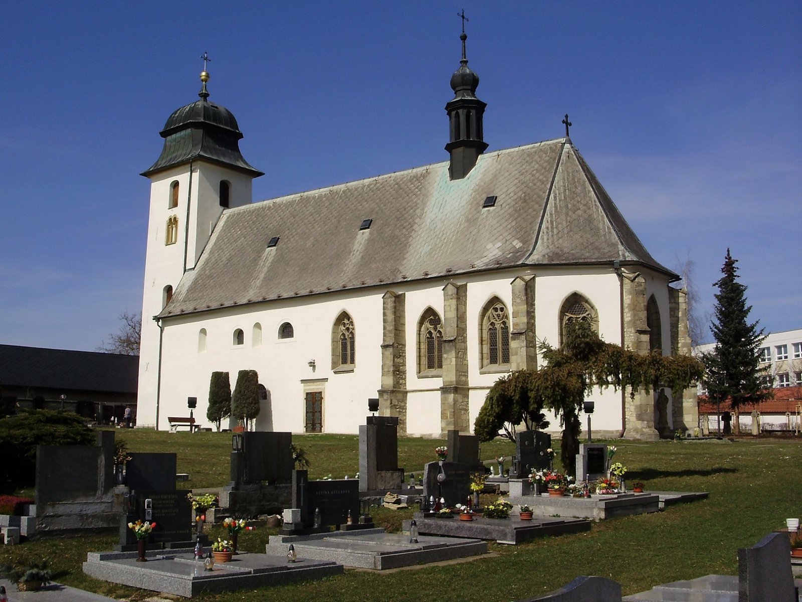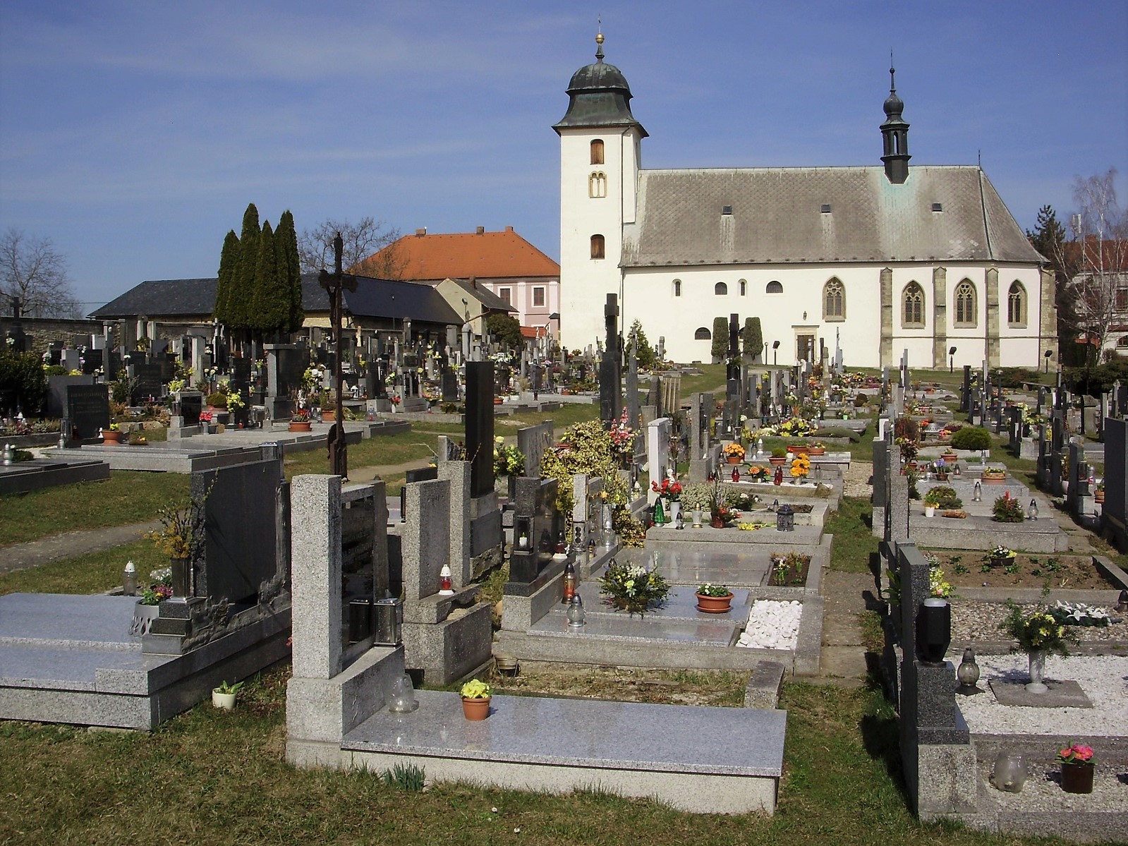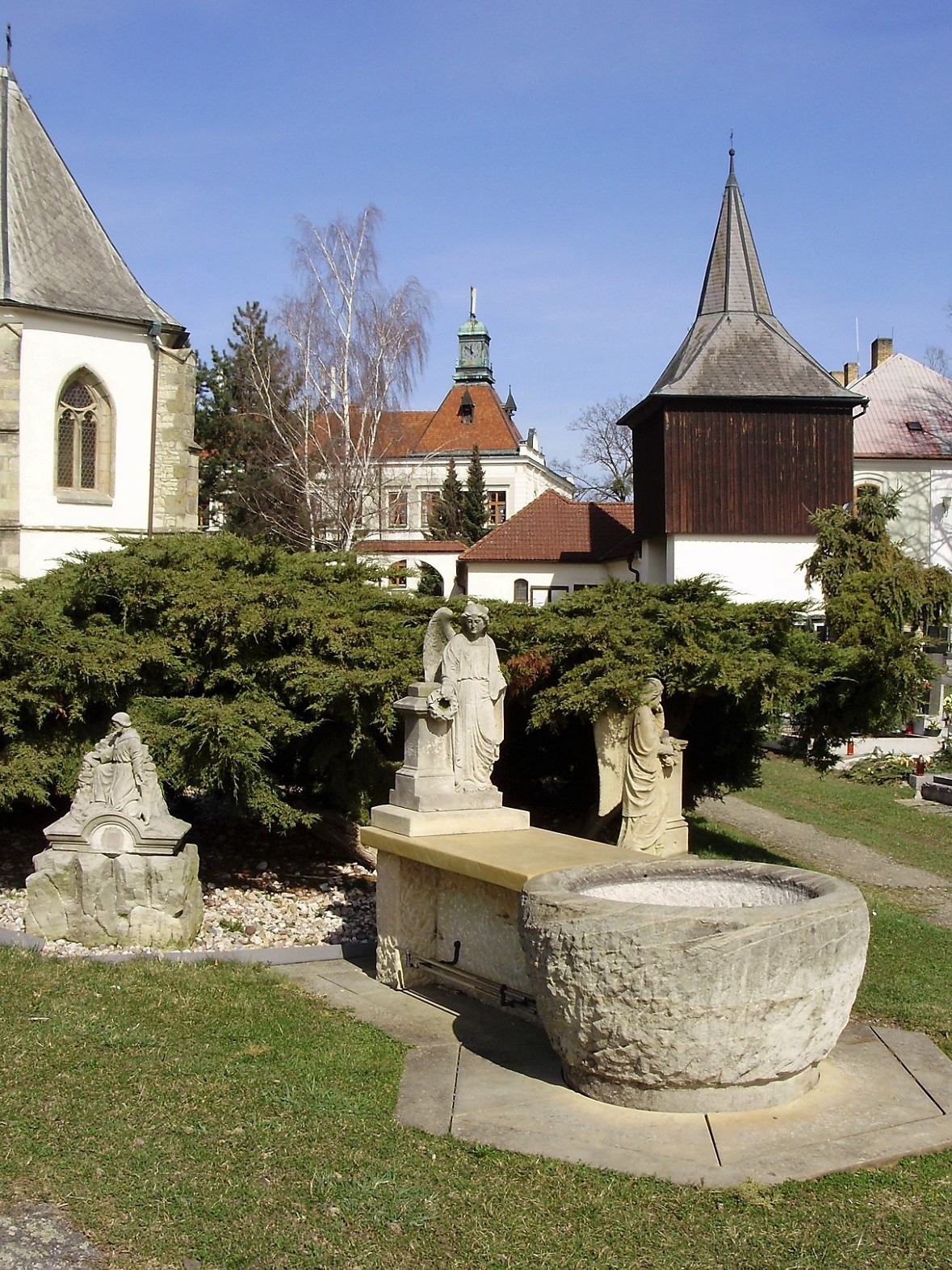 Historická část hřbitova kolem kostela se již k pohřbívání nevyužívá (zrušeno 1908), výjimkou jsou hroby duchovních u presbytáře a řada podél západní ohradní zdi. Prostor severně od kostela je nyní nápaditě upraven do podoby meditativní zahrady s ojediněle pojatou křížovou cestou a moderním pomníkem obětem 1. světové války.