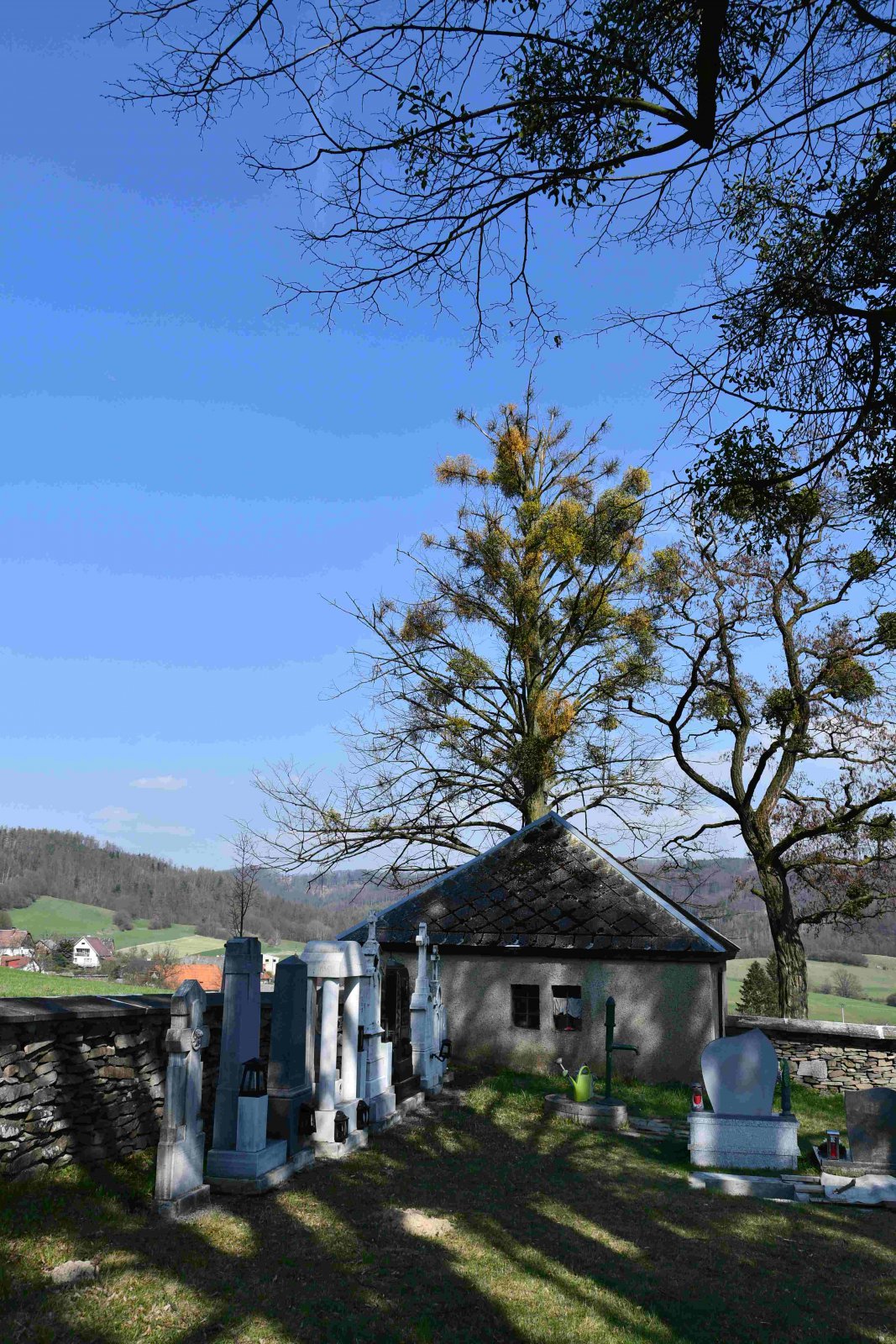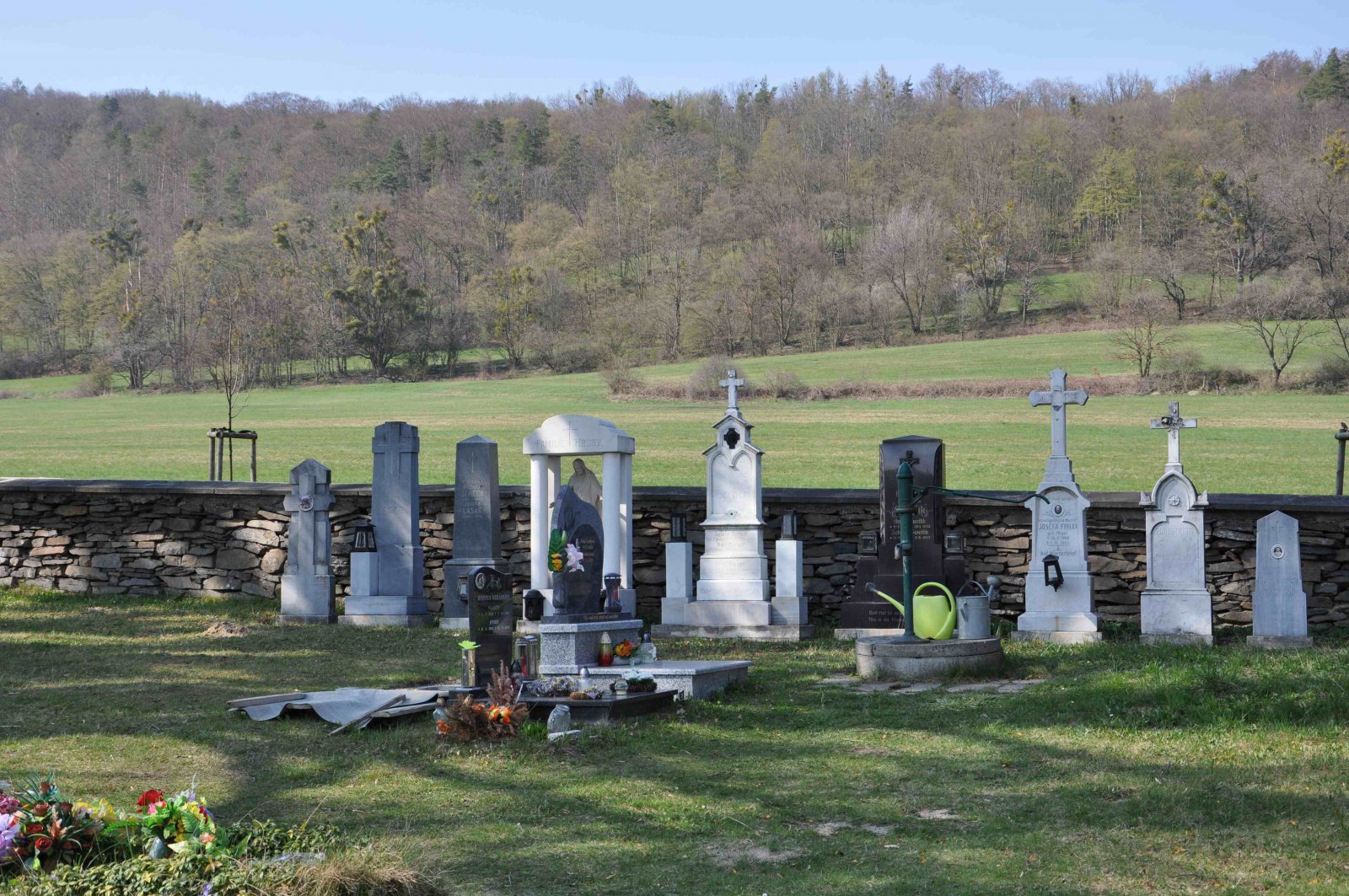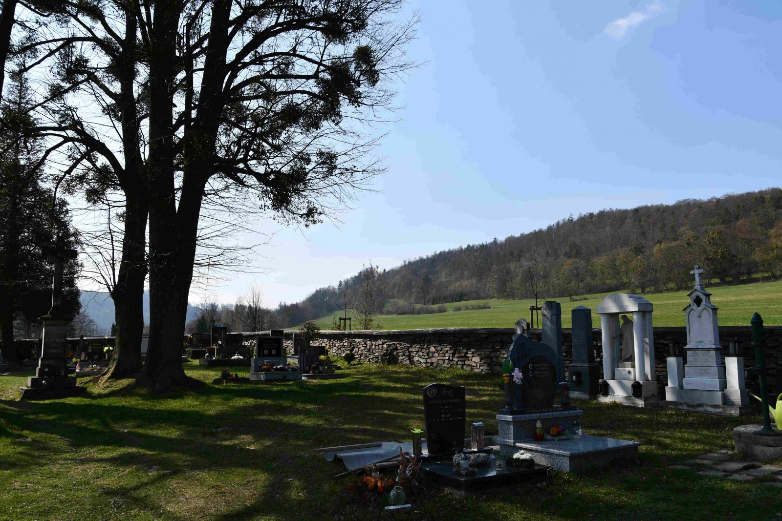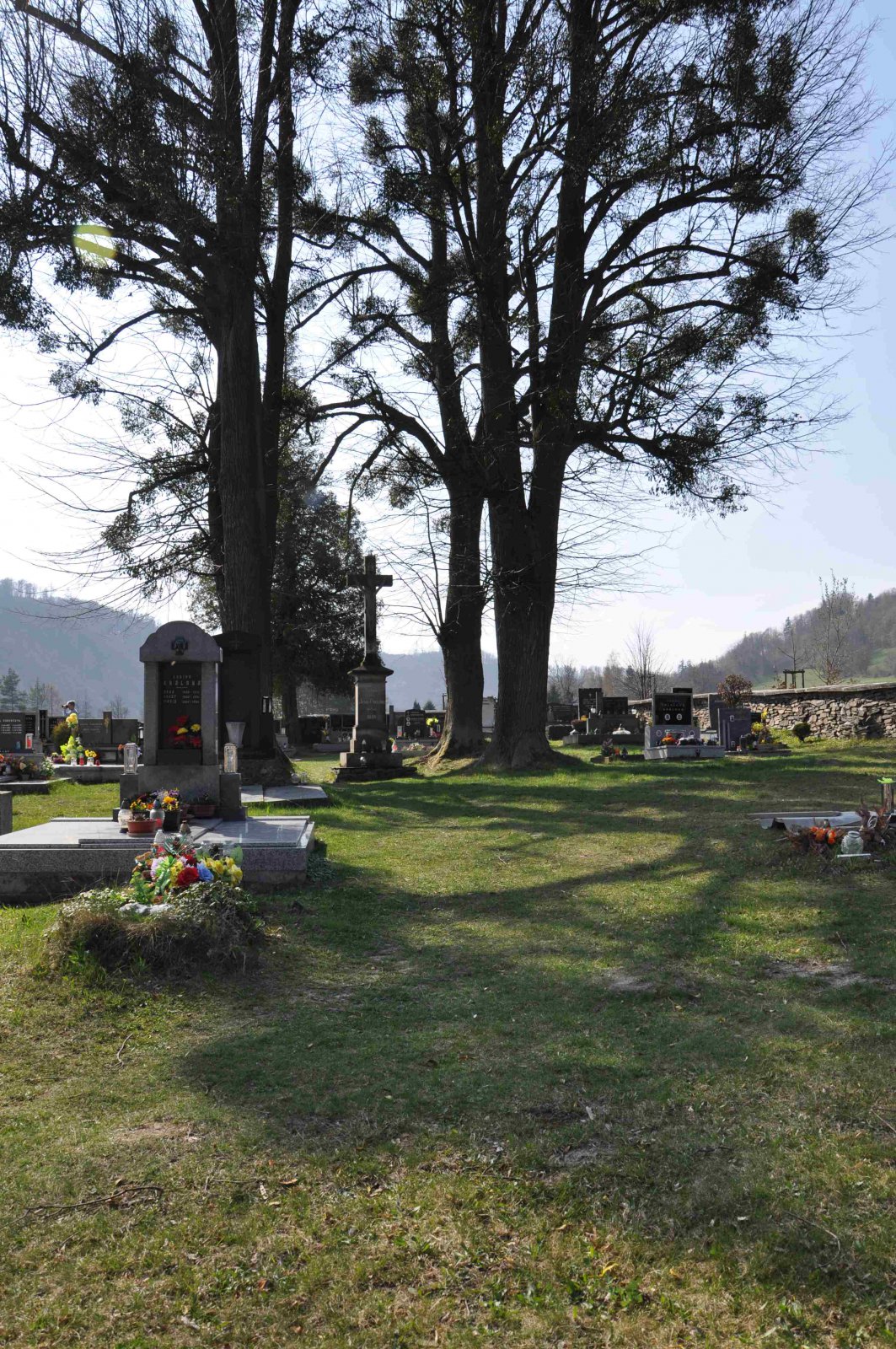 Malý stále využívaný hřbitov se nachází u polní cesty za obcí. Hřbitovní brána a márnice je udržovaná, hřbitov obklopuje kamenná zeď, uprostřed je velký kamenný centrální kříž. Hřbitov je celkově udržovaný. Část z poměrně velkého počtu původních německých náhrobků, které se na hřbitově stále nacházejí, je přemístěna a znovu postavena u hřbitovní zdi.