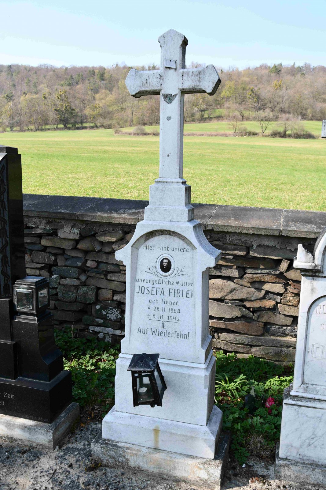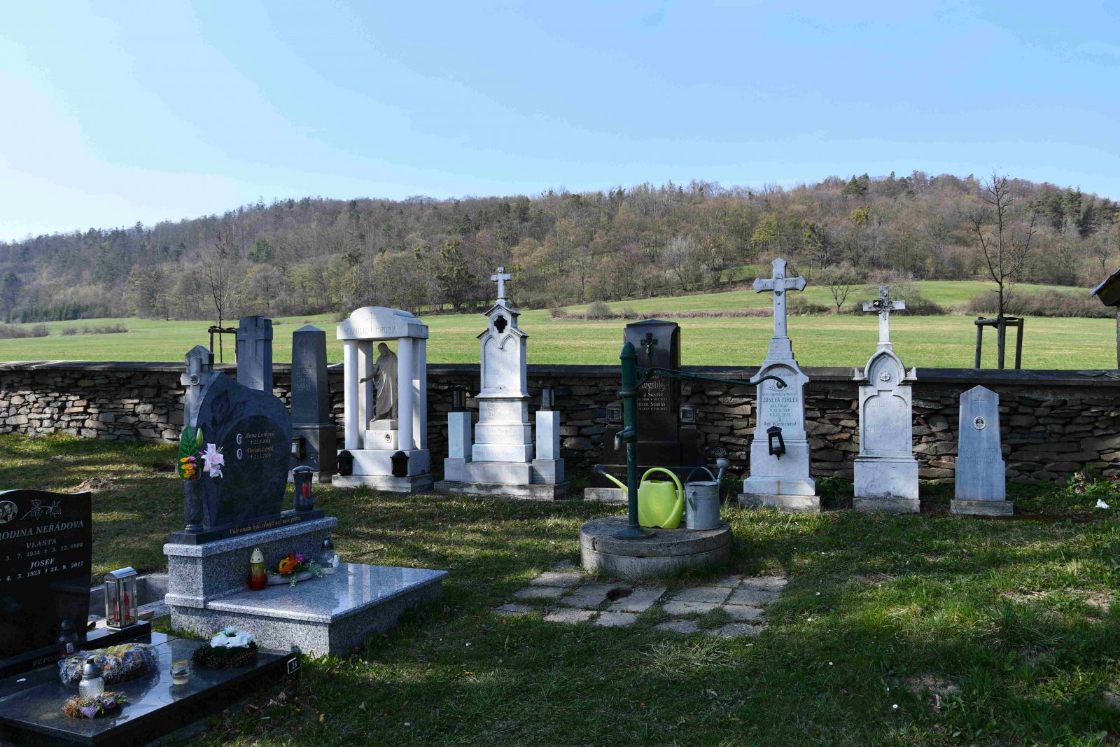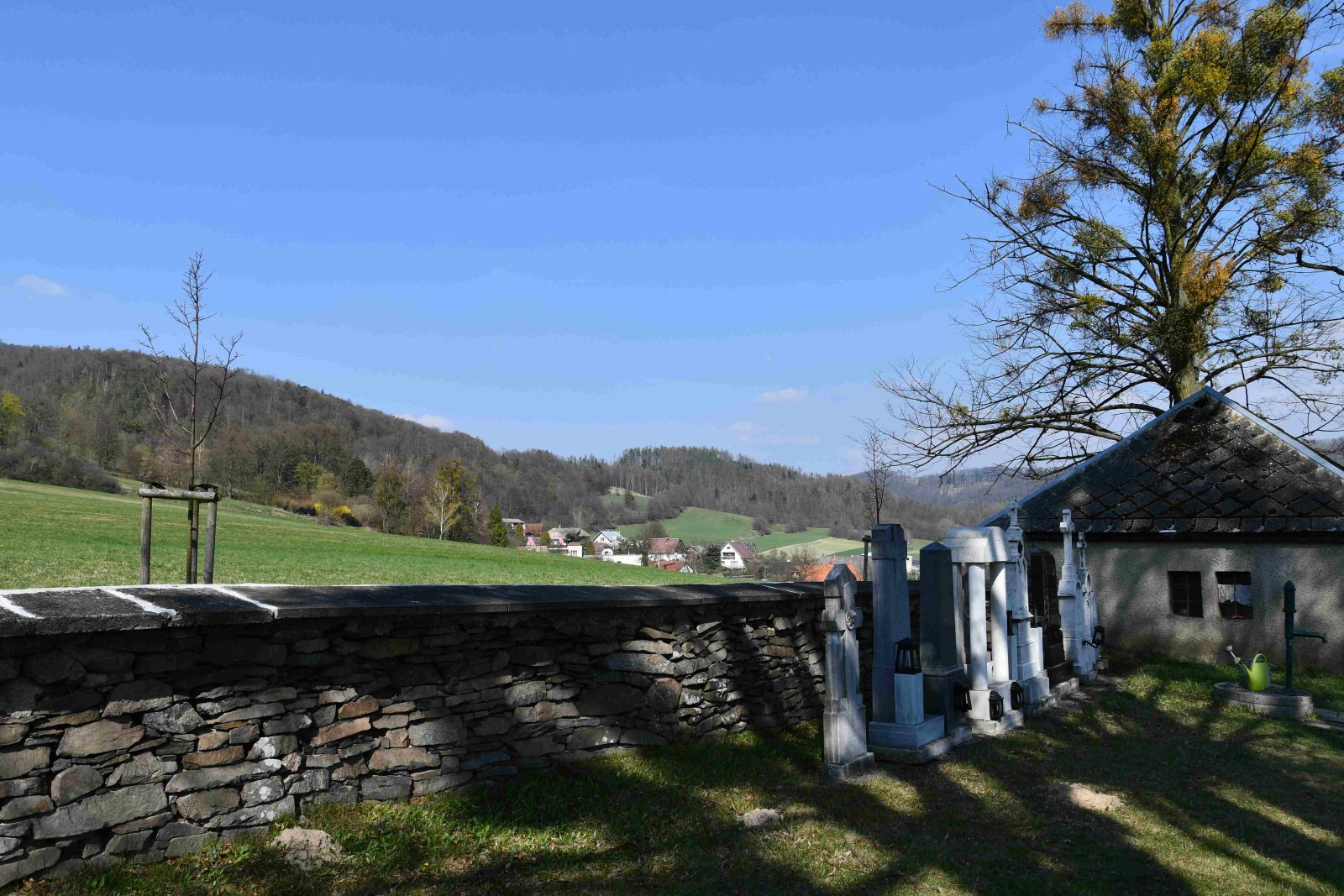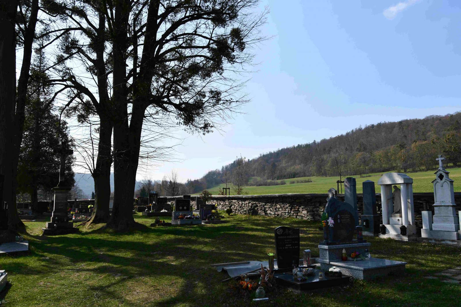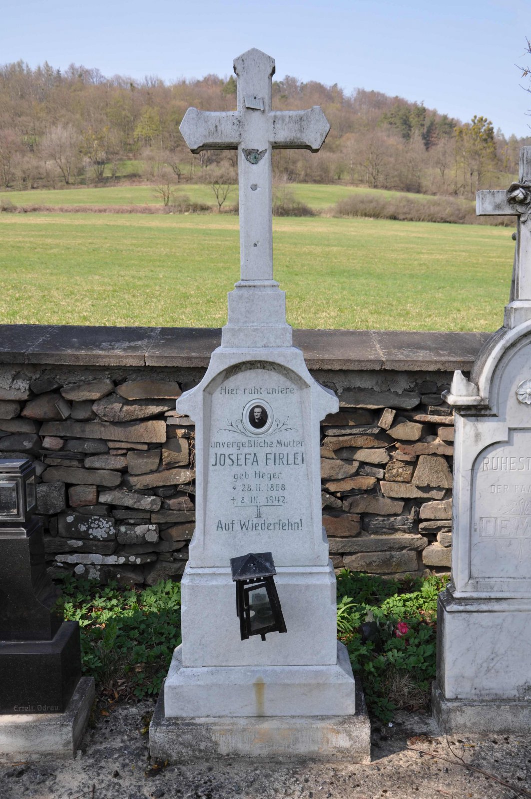 Malý stále využívaný hřbitov se nachází u polní cesty za obcí. Hřbitovní brána a márnice je udržovaná, hřbitov obklopuje kamenná zeď, uprostřed je velký kamenný centrální kříž. Hřbitov je celkově udržovaný. Část z poměrně velkého počtu původních německých náhrobků, které se na hřbitově stále nacházejí, je přemístěna a znovu postavena u hřbitovní zdi.