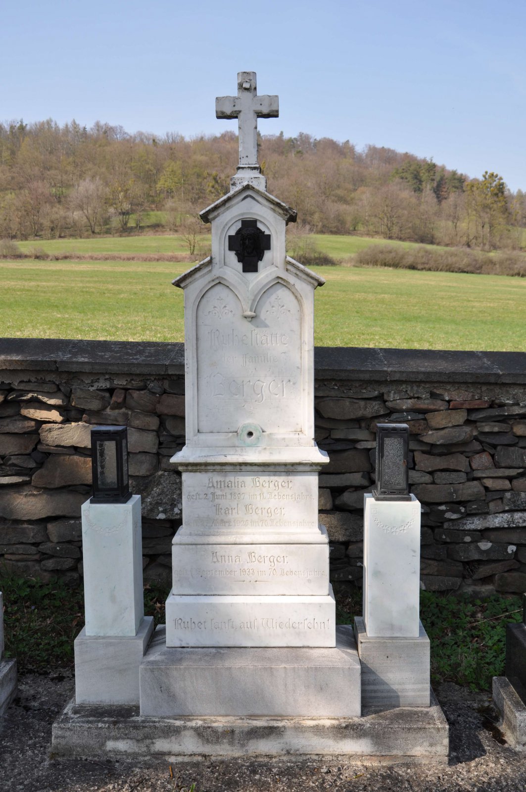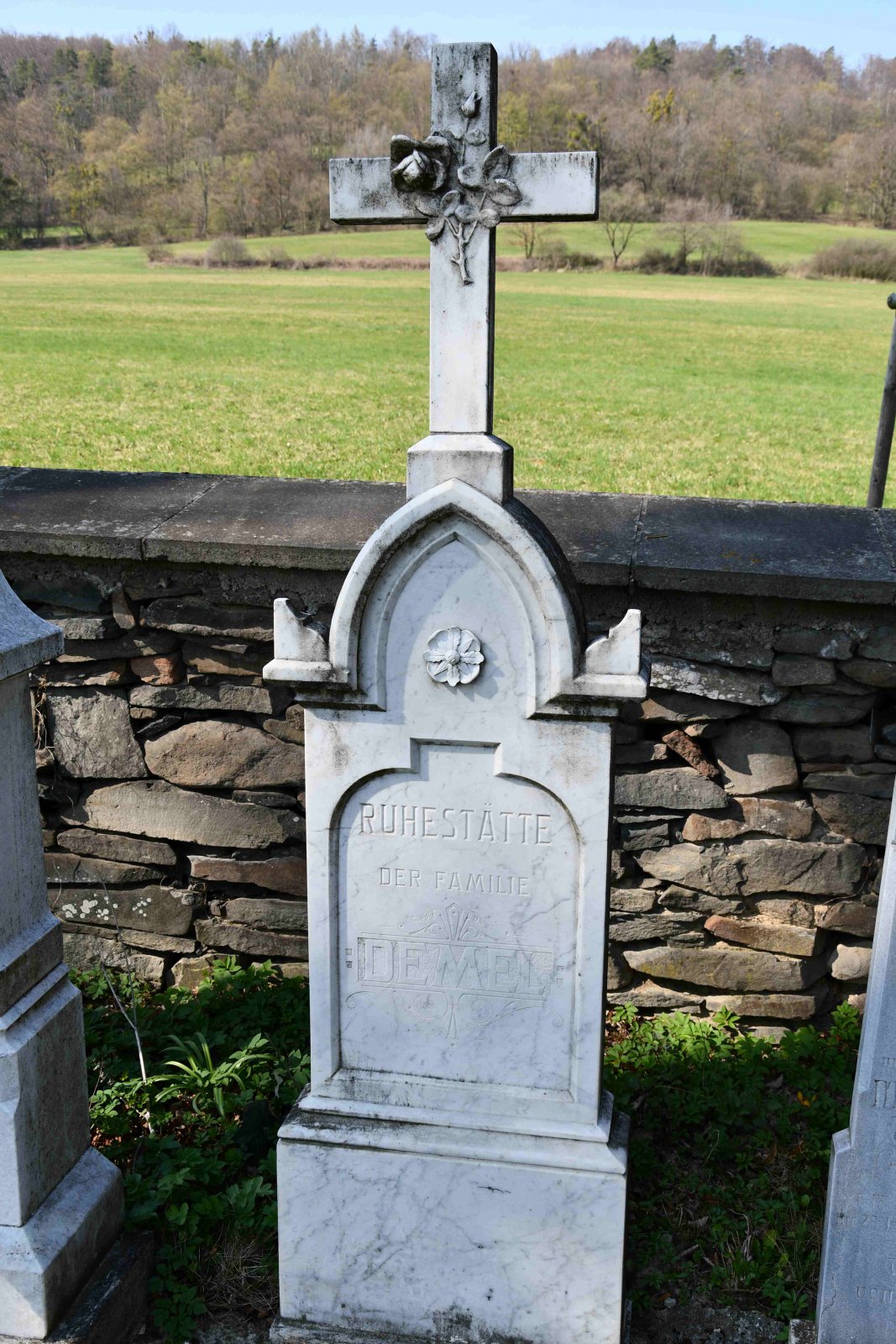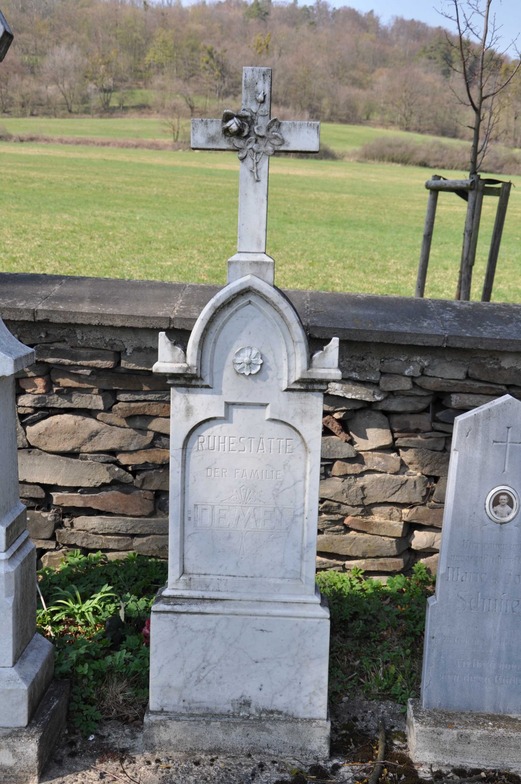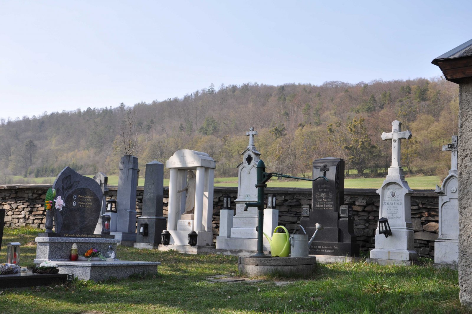 Malý stále využívaný hřbitov se nachází u polní cesty za obcí. Hřbitovní brána a márnice je udržovaná, hřbitov obklopuje kamenná zeď, uprostřed je velký kamenný centrální kříž. Hřbitov je celkově udržovaný. Část z poměrně velkého počtu původních německých náhrobků, které se na hřbitově stále nacházejí, je přemístěna a znovu postavena u hřbitovní zdi.