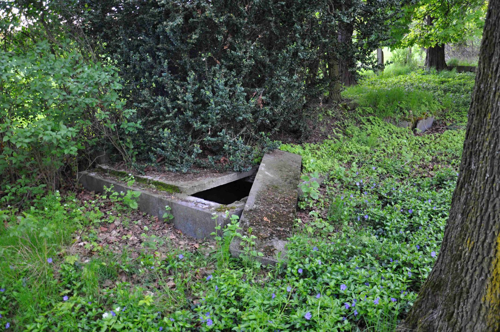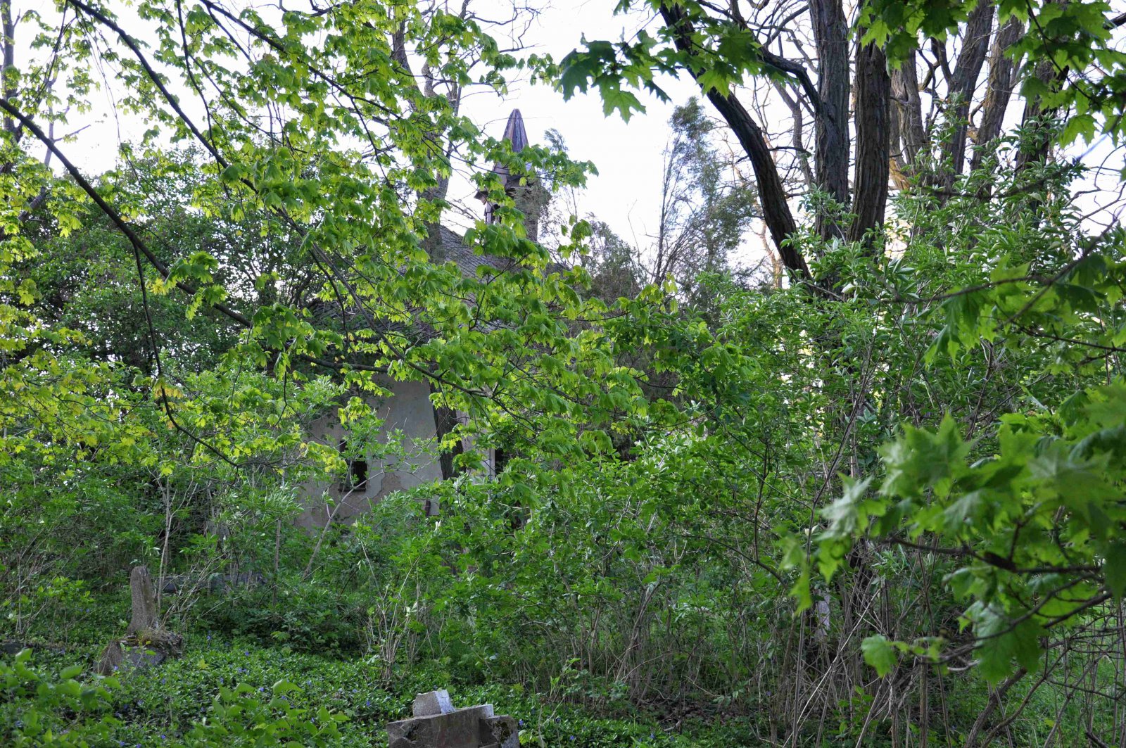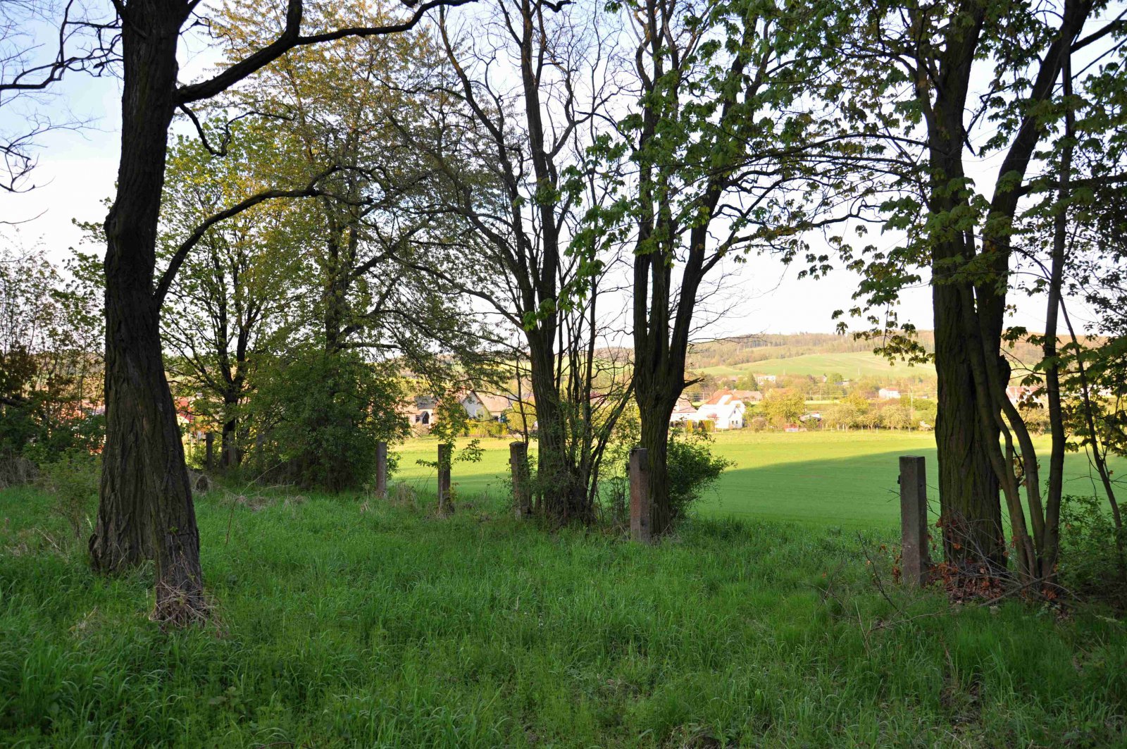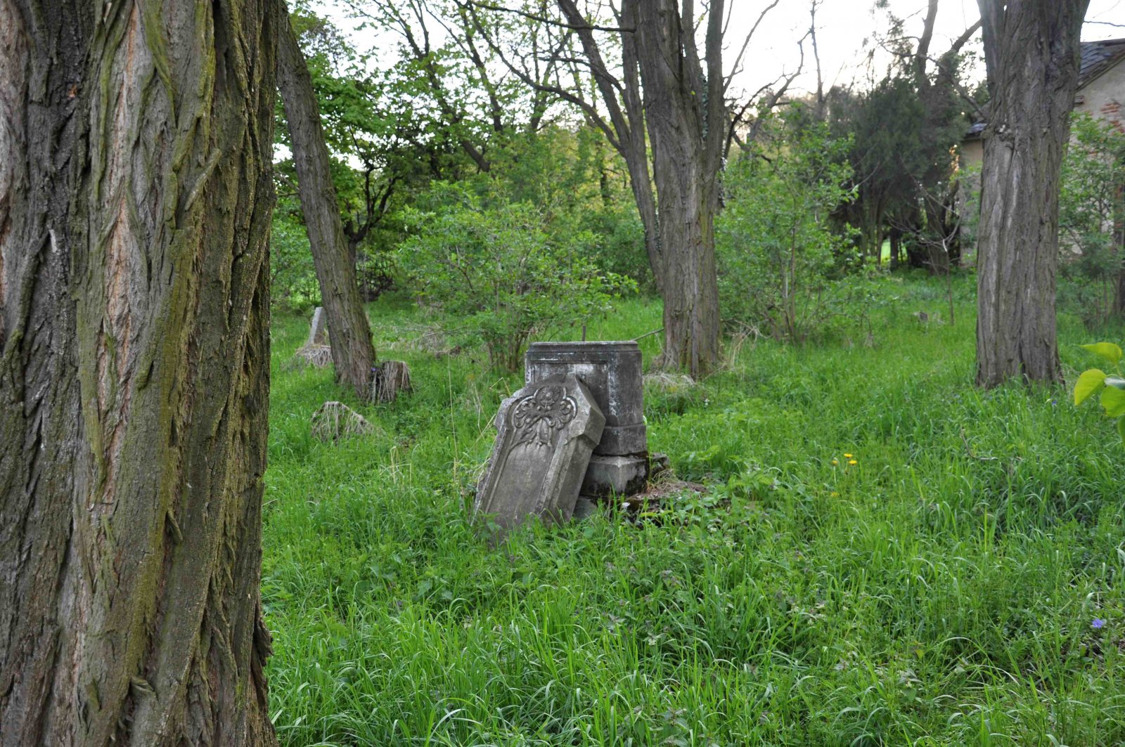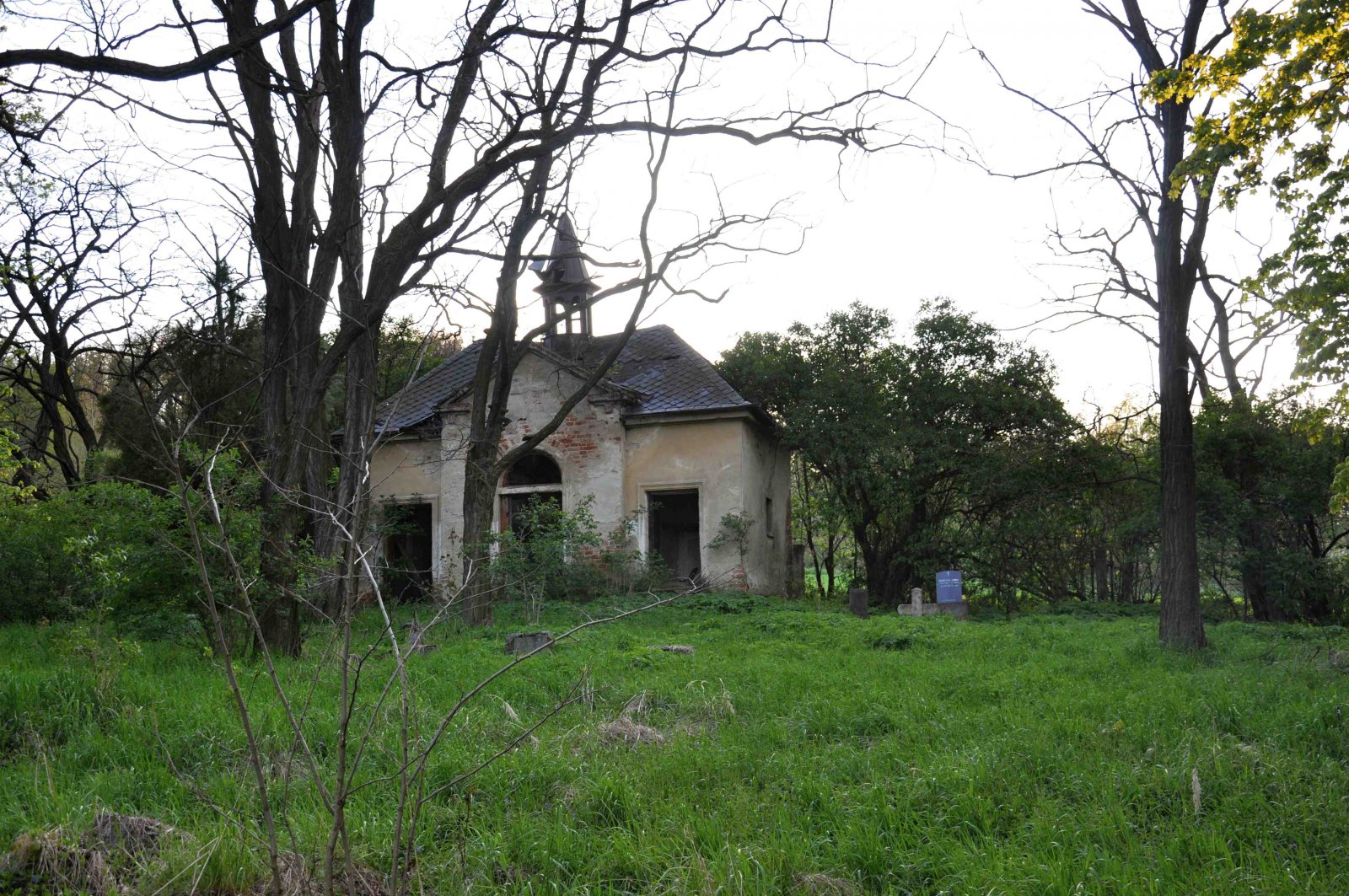 Zničený hřbitov se nachází za obcí u polní cesty.