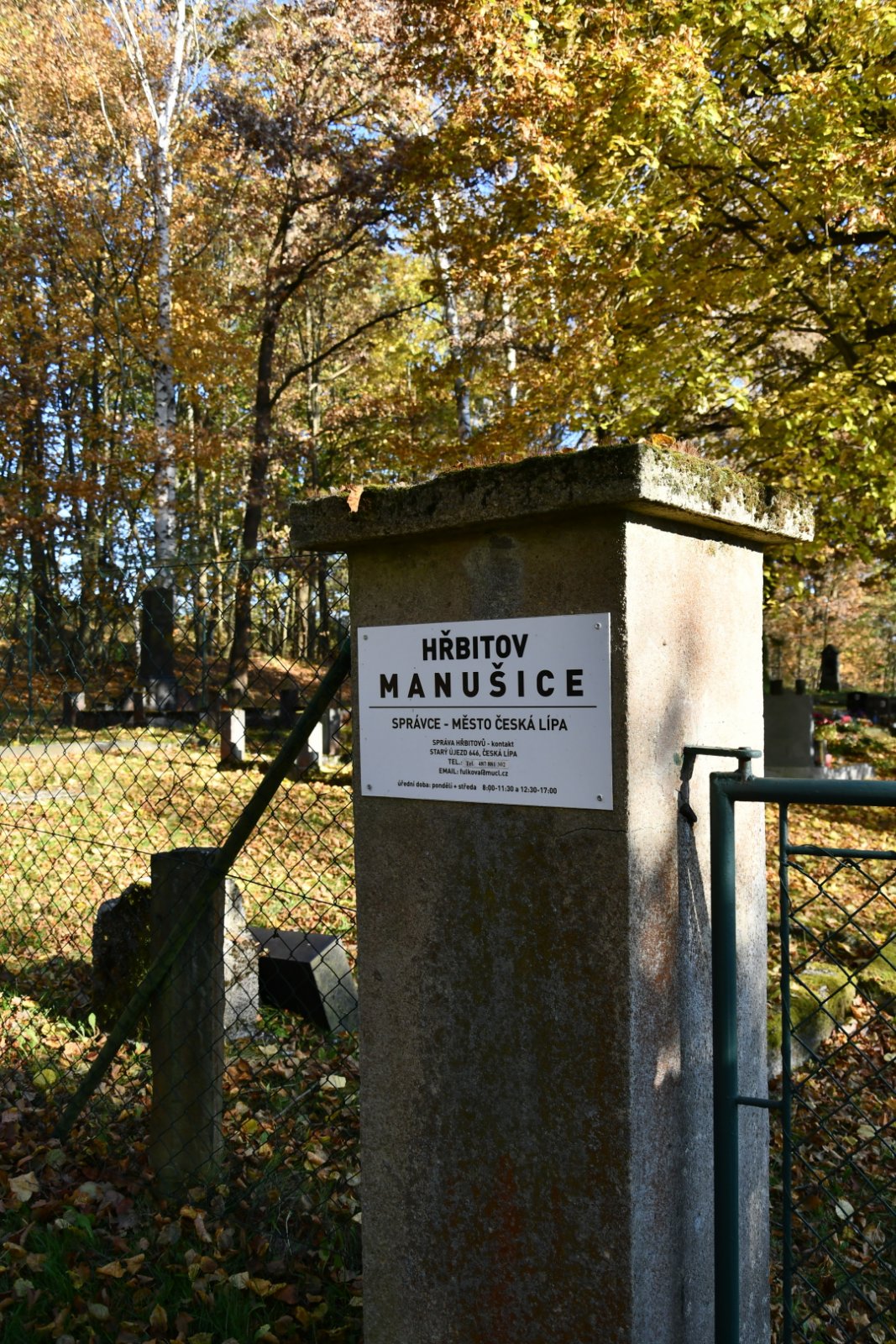 | Městský úřad Česká Lípa Odbor správy majetku Majetková správa hřbitovů Starý Újezd 646 470 01 Česká Lípa Tel.: 487 881 302 Email: fulkova@mucl.cz URL: https://www.mucl.cz/hrbitov/ds-1098 | |