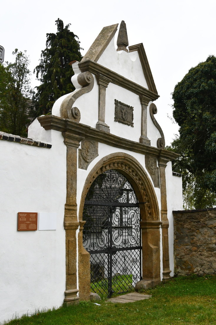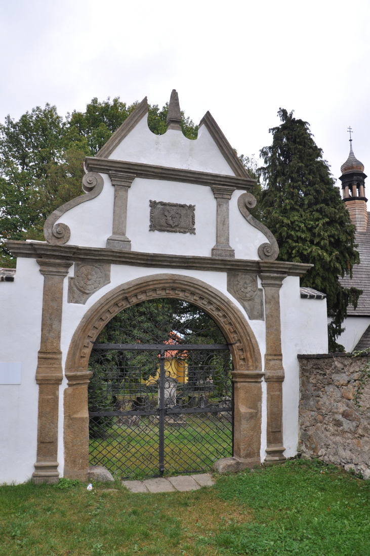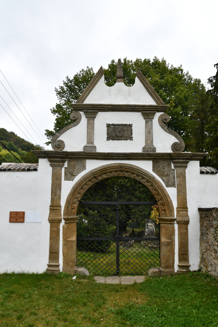 Na hřbitov se vstupuje renesanční branou z roku 1615 postavenou na náklady krupského obchodníka Georga Klippela. Tvoří ji polokruhový vchod s pilastry, které podpírají římsu s vysokým rozeklaným volutovým štítem. Na sever od kostela roste na hřbitově dub zimní chráněný jako památný strom.
