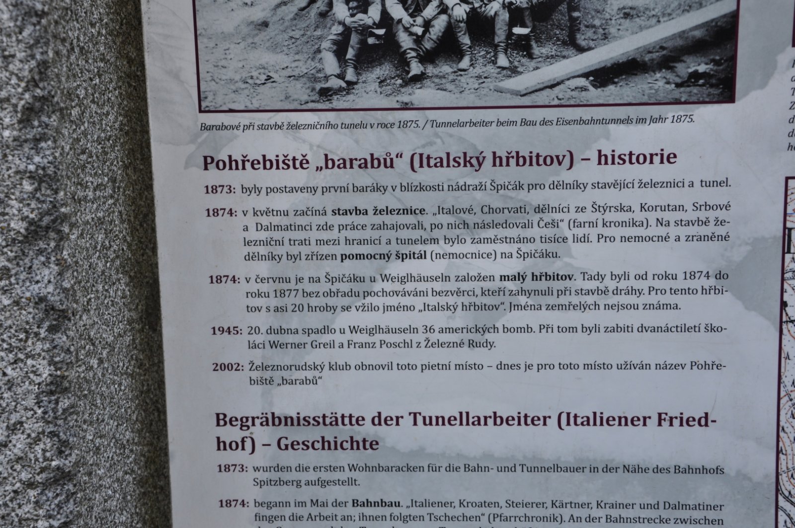 Na stavbě železnice od roku 1874 do roku 1877 pracovali Italové, Chorvati, dělníci ze Štýrska, Korutan, Srbové a Dalmatinci, zavní barabové. Po nich přicházeli Češi. Na stavbě v té době byly zaměstnány stovky dělníků.