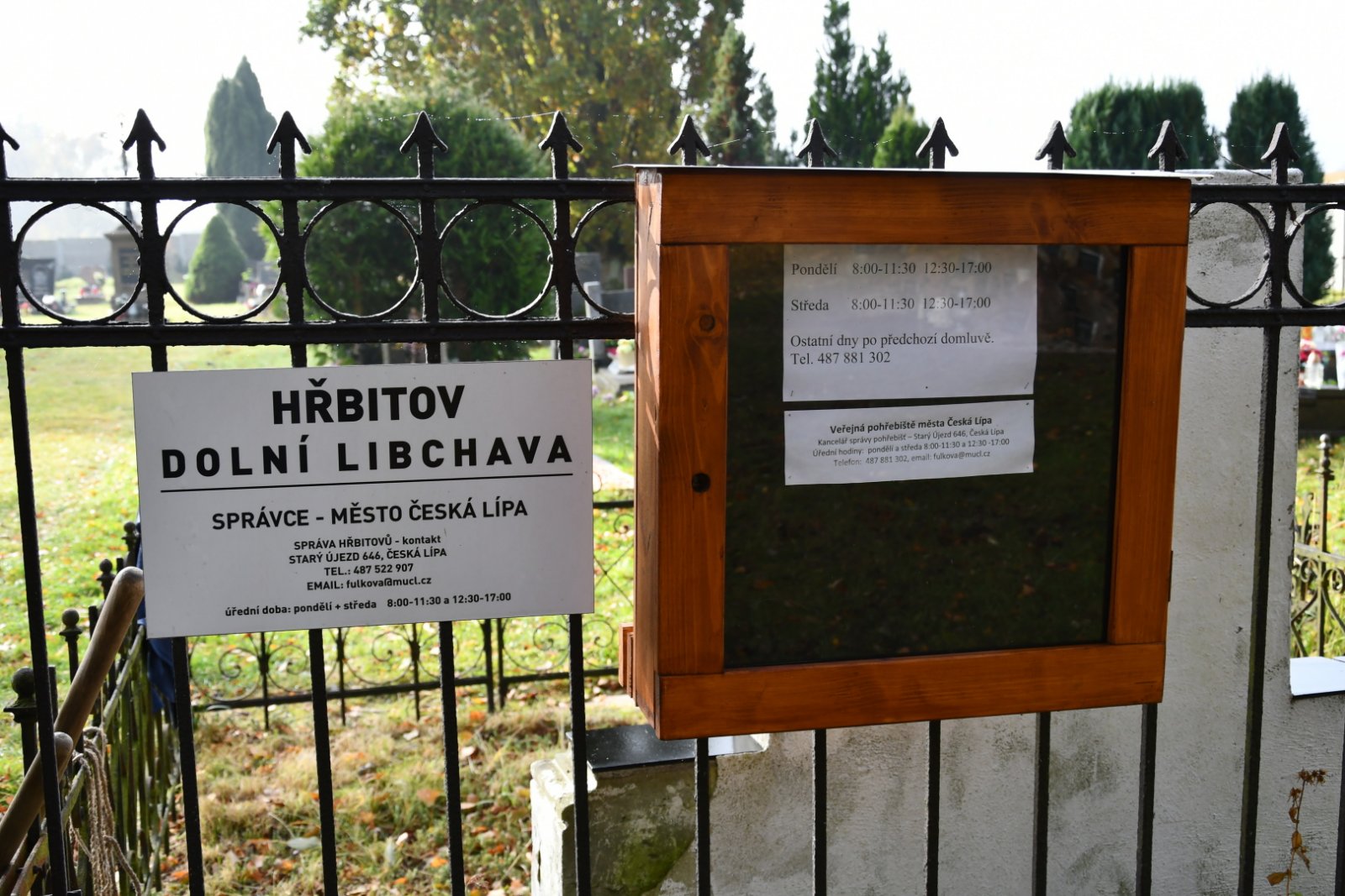 | Městský úřad Česká Lípa Odbor správy majetku Majetková správa hřbitovů Starý Újezd 646 470 01 Česká Lípa Tel.: 487 881 302 Email: fulkova@mucl.cz URL: https://www.mucl.cz/hrbitov/ds-1098 | |